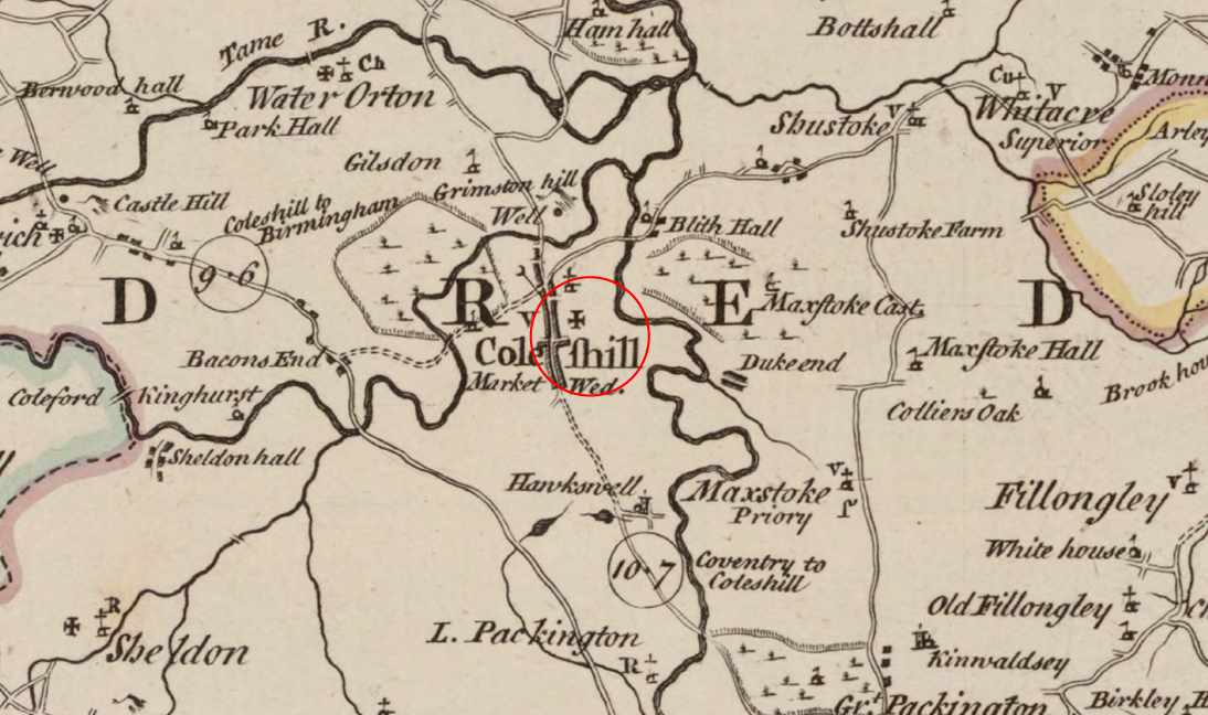 Coleshill was then recorded as ‘Coleshelle’ in 1086 and was a settlement in the Domesday book, located in the hundred of Coleshill in the county of Warwickshire. It had a recorded population of 54 households in 1086, putting it in the largest 20% of settlements recorded at the time. The land belonged to King William, with the Lord in 1066 recorded as King Edward.