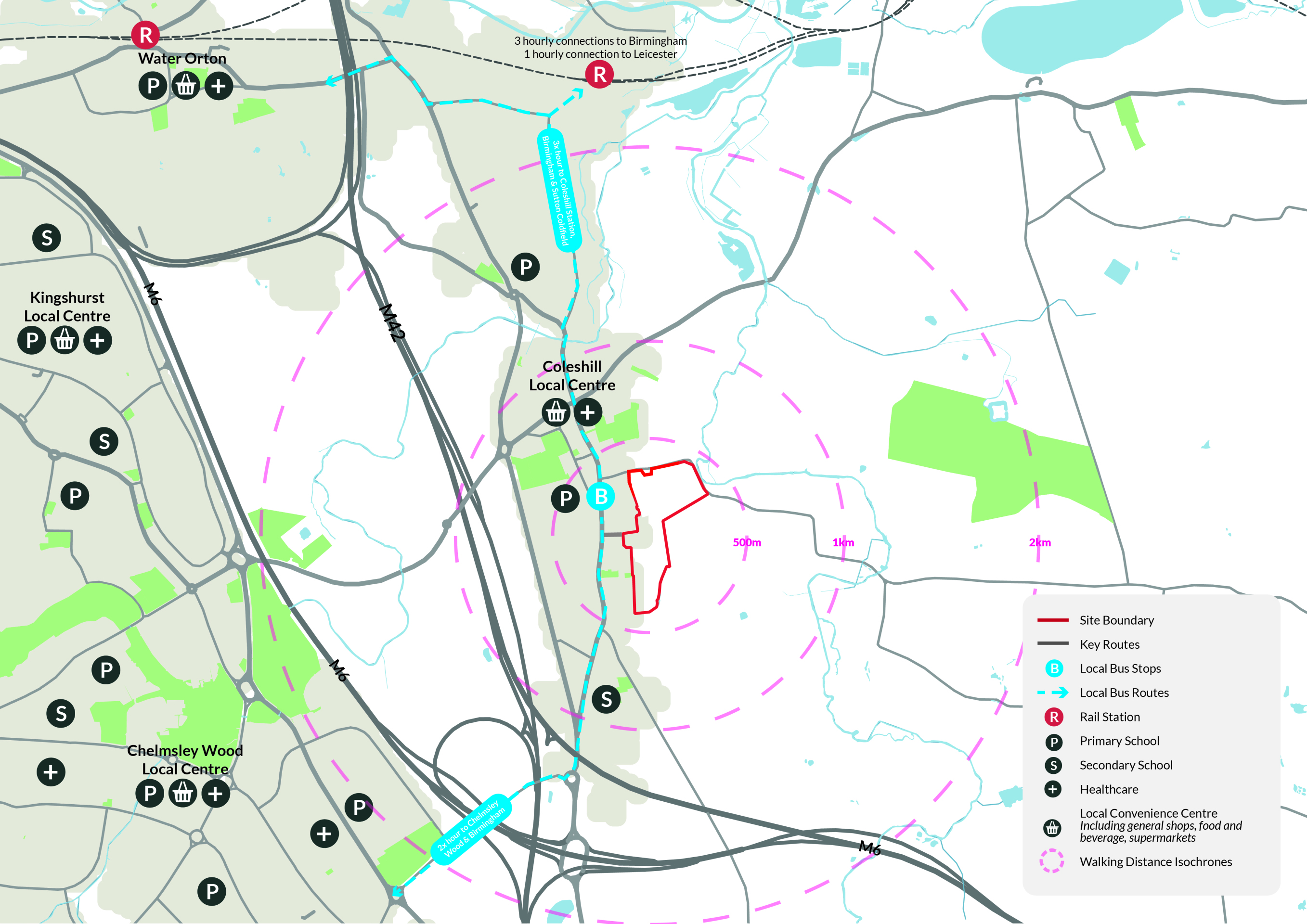 In terms of wider connectivity, the site is in a highly sustainable location, being immediately adjacent to the existing settlement boundary of Coleshill. The town centre and its shops are around 600m north of the site and a large food supermarket is 750m from the northern boundary of the site. Coleshill Primary School is c750m from the centre of the site and Woodlands Primary School and Coleshill Secondary School are 1km to the south. There are existing bus stops located close to the site along Coventry Road served by the X13 which provides a half hourly service between Chelmsley Wood and Birmingham City Centre. Coleshill Parkway Station is c2.5km from the centre of the site which is a reasonable cycling distance and at the upper limit of the distance people could be expected to walk. This provides access to Birmingham, Leicester and Stanstead Airport. The large employment area around Gorsey Lane and Roman Way is also accessible by walking and cycling from the site.