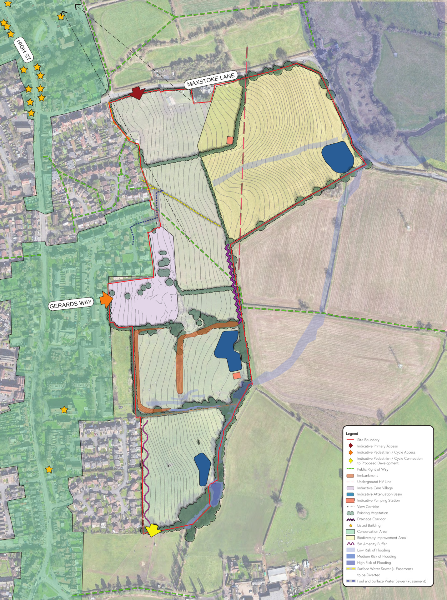 A secondary access for pedestrians and cyclists will be provided from Gerards Way, which will also provide access for emergency vehicles should it be required. Gerards Way is a quieter lower speed environment and provides a more direct access for future residents to the secondary school as well as providing an alternative route to the primary school via active travel means. There will be no through route for traffic between Maxstoke Lane and Gerards Way.